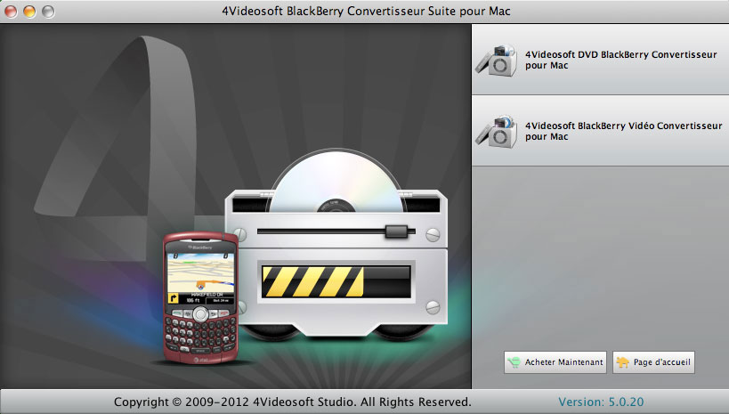 BlackBerry Convertisseur Suite pour Mac est équipé de deux logiciels professionnels: DVD BlackBerry Convertisseur pour Mac et BlackBerry Vidéo Convertisseur pour Mac. Avec ces deux Convertisseur de BlackBerry pour les utilisateurs de Mac, vous pouvez facilement convertir tout fichier de DVD/vidéo en format vidéo ou audio compatible avec BlackBerry.